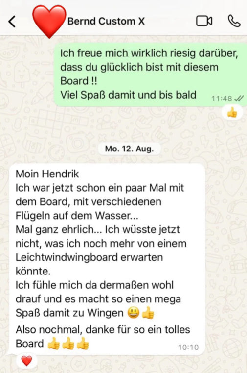 Wir sind erst zufrieden, wenn unsere Kunden überglücklich sind. Das sagt z.B. Bernd über sein neues Vampire Custom X Wingfoil Board…